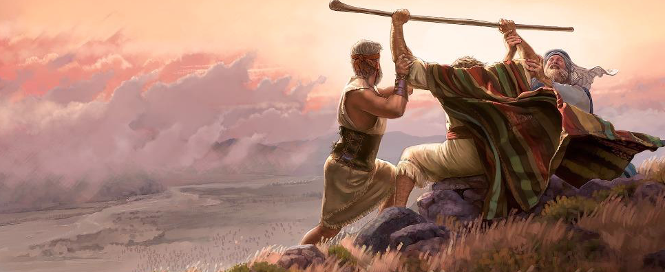 Moisés, guiado por Dios, eleva sus manos en oración, y la batalla se inclina a favor de los israelitas. Mientras Moisés mantenga sus manos levantadas, Dios le concede la victoria. Cuando sus manos se cansan, los israelitas empiezan a perder la batalla. Aarón y Hur ayudan a sostener las manos de Moisés, permitiendo que la oración se mantenga constante y la victoria sea asegurada.